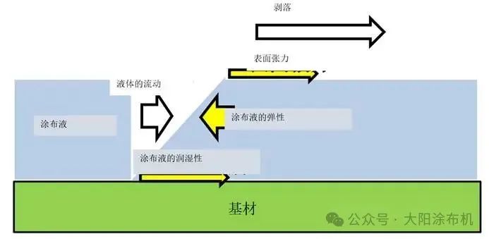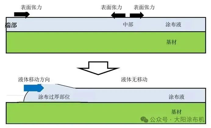 涂布面中心部位因表面張力作用導(dǎo)致涂布液向左右兩側(cè)擴散,而端部涂布液受表面張力單向牽引(僅向右),引發(fā)液體向右側(cè)遷移并形成局部增厚區(qū)域。