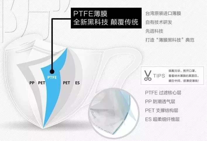 靜電被添加之后,并不是處于始終飽和的狀態(tài),在口罩生產(chǎn)、包裝、出廠、運(yùn)輸,再到消費(fèi)者手中,打開使用,每一個(gè)環(huán)節(jié)都會(huì)使無紡布層中的靜電含量逐步減少,而靜電的衰減必然導(dǎo)致熔噴無紡布口罩防護(hù)效能的下降。為此,市場上又出現(xiàn)了利用PTFE納米薄膜和核孔膜制作的防霧霾口罩。