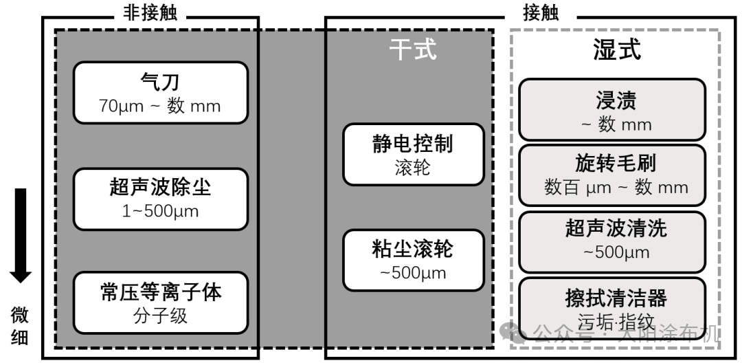 氣刀除塵法通過(guò)噴射高壓空氣剝離基材表面異物,并由真空系統(tǒng)同步回收去除的污染物。但其有效性受限于空氣阻力,氣流在距離薄膜表面數(shù)十微米處顯著衰減,導(dǎo)致邊界層內(nèi)微小異物的剝離力急劇下降(因風(fēng)力減弱無(wú)法將異物卷?yè)P(yáng)至紊流層),故難以清除此類(lèi)微粒。