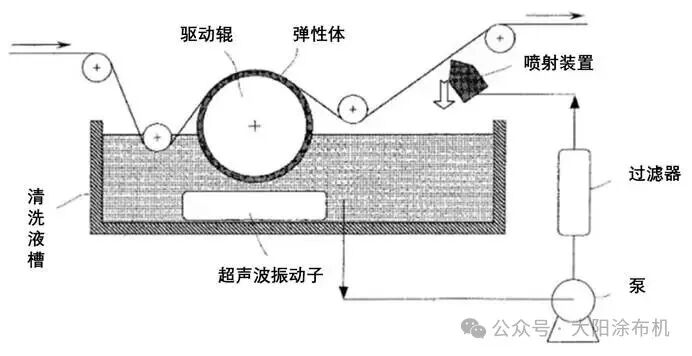 該裝置通過(guò)彈性體包覆的驅(qū)動(dòng)輥引導(dǎo)基材包繞接觸,施加面壓力并保持線速度差實(shí)現(xiàn)表面擦拭;下游噴射裝置隨即對(duì)擦拭面進(jìn)行液體清洗,形成“機(jī)械摩擦+液體沖刷”的協(xié)同除塵流程。
